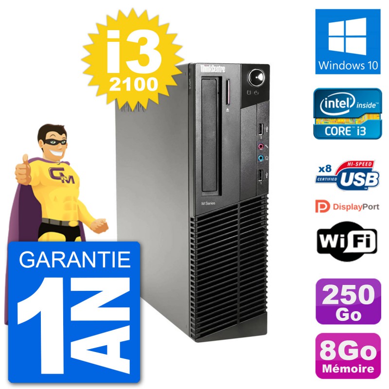 PC Lenovo ThinkCentre M91p SFF - Intel Core i3-2100 3.1 Ghz (3 Mo) - 8 Go DDR3 - Disque Dur 3,5" 250 Go - Graveur DVD - Clef Wifi USB - Windows 10 - Garantie 1 an.