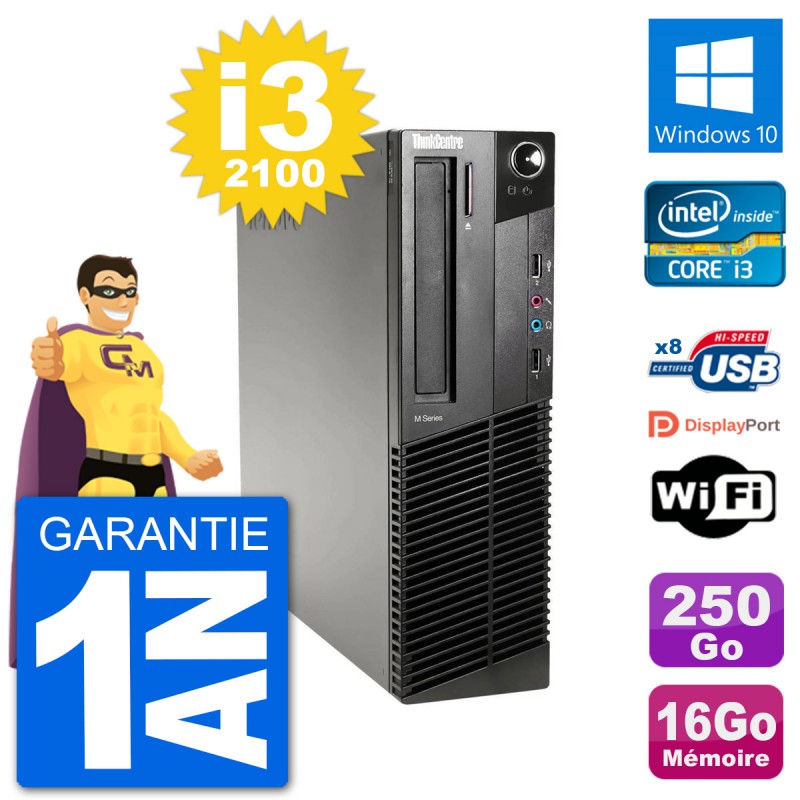 PC Lenovo ThinkCentre M91p SFF - Intel Core i3-2100 3.1 Ghz (3 Mo) - 16 Go DDR3 - Disque Dur 3,5" 250 Go - Graveur DVD - Clef Wifi USB - Windows 10 - Garantie 1 an.