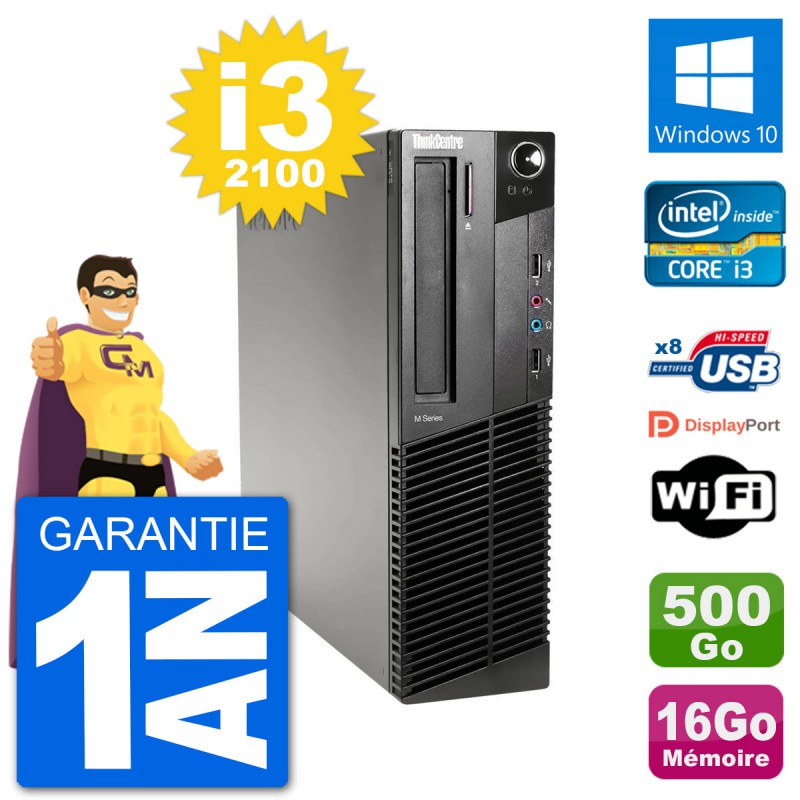 PC Lenovo ThinkCentre M91p SFF - Intel Core i3-2100 3.1 Ghz (3 Mo) - 16 Go DDR3 - Disque Dur 3,5" 500 Go - Graveur DVD - Clef Wifi USB - Windows 10 - Garantie 1 an.