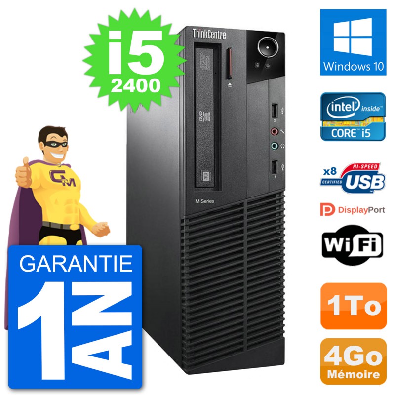 PC Lenovo ThinkCentre M91p SFF - Intel Core i5-2400 3.1 Ghz (6 Mo) - 4 Go DDR3 - Disque Dur 3,5" 1 To - Graveur DVD - Clef Wifi USB - Windows 10 - Garantie 1 an.