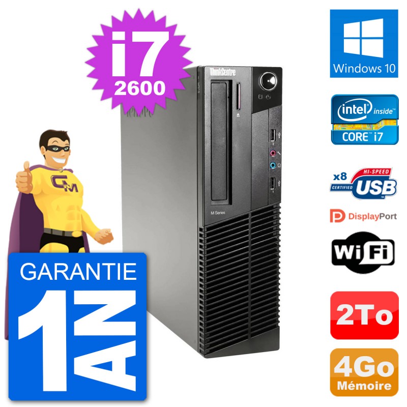 PC Lenovo ThinkCentre M91p SFF - Intel Core i7-2600 3.4 Ghz (8 Mo) - 4 Go DDR3 - Disque Dur 3,5" 2 To - Graveur DVD - Clef Wifi USB - Windows 10 - Garantie 1 an.