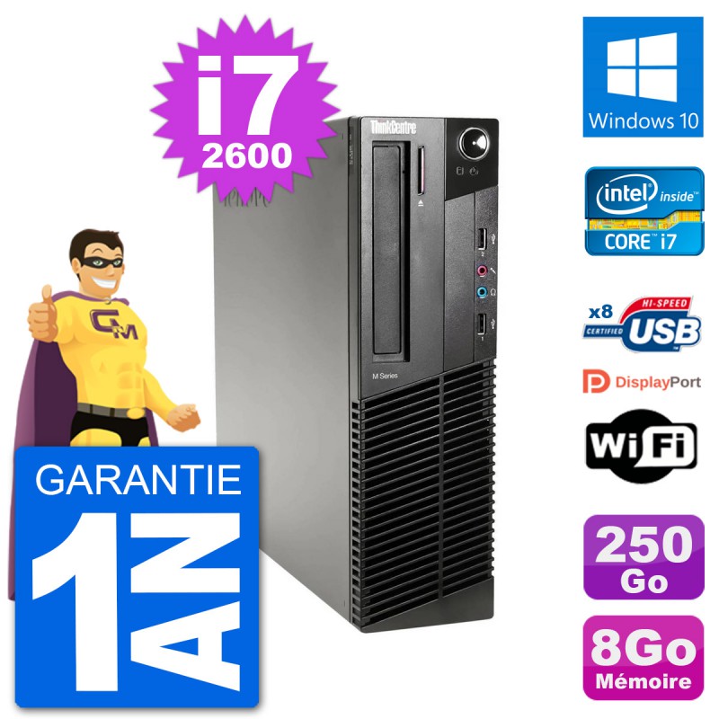 PC Lenovo ThinkCentre M91p SFF - Intel Core i7-2600 3.4 Ghz (8 Mo) - 8 Go DDR3 - Disque Dur 3,5" 250 Go - Graveur DVD - Clef Wifi USB - Windows 10 - Garantie 1 an.
