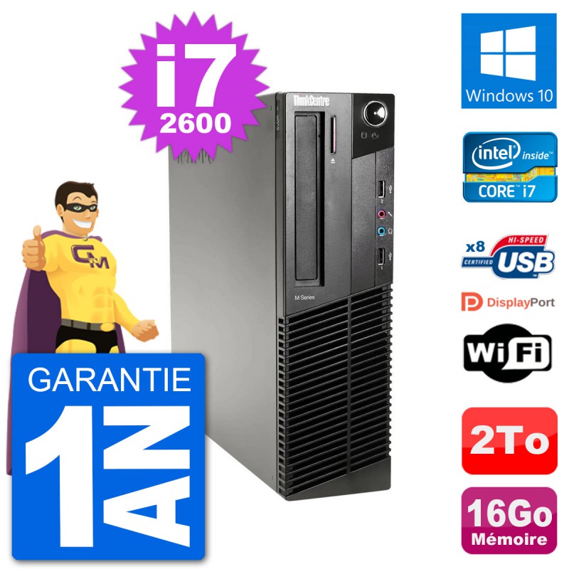 PC Lenovo ThinkCentre M91p SFF - Intel Core i7-2600 3.4 Ghz (8 Mo) - 16 Go DDR3 - Disque Dur 3,5" 2 To - Graveur DVD - Clef Wifi USB - Windows 10 - Garantie 1 an.