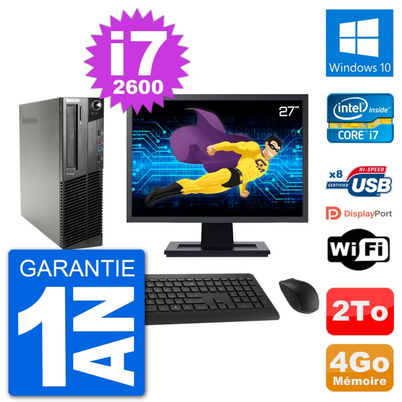 PC Lenovo M91p SFF - Intel Core i7-2600 3.4 Ghz (8 Mo) - 4 Go DDR3 - Disque Dur 3,5" 2 To - Graveur DVD - Clef Wifi USB - Windows 10 - Livré avec Ecran 27" + clavier + souris (Marques et modèles variables) - Garantie 1 an.