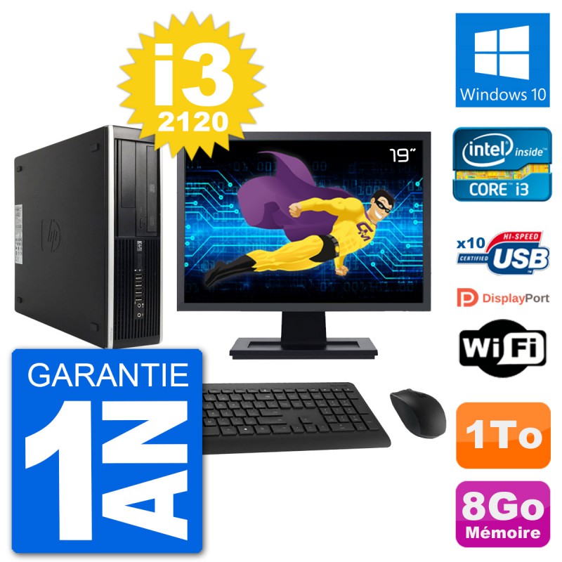 PC HP 8200 Elite SFF Ecran 19" Intel i3-2120 RAM 8Go Disque Dur 1To Windows 10 Wifi