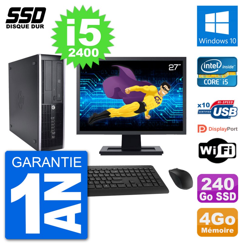 PC HP 8200 Elite SFF (Slim) - Intel Core i5-2400 3.1 Ghz (6 Mo) - 4 Go DDR3 - Disque Dur SSD 240 Go - Graveur DVD - Clef Wifi USB - Windows 10 - Livré avec Ecran 27" + clavier + souris (Marques et modèles variables) - Garantie 1 an.