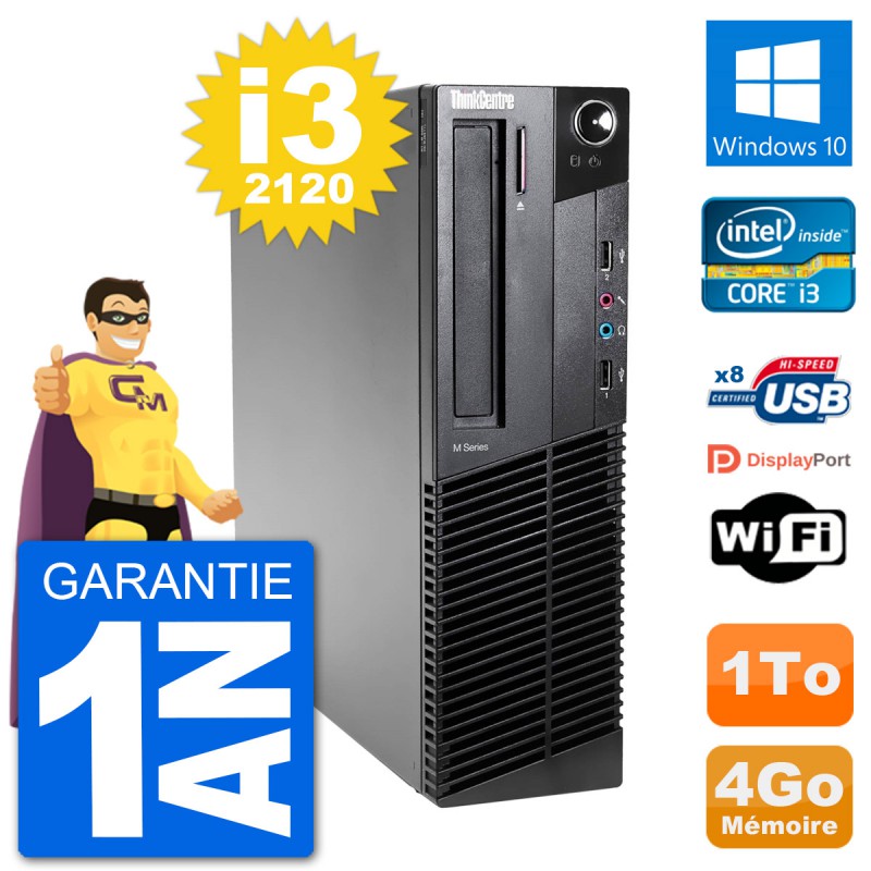 PC Lenovo ThinkCentre M92p SFF - Intel Core i3-2120 3.3 Ghz (3 Mo) - 4 Go DDR3 - Disque Dur 3,5" 1 To - Graveur DVD - Clef Wifi USB - Windows 10 - Garantie 1 an.