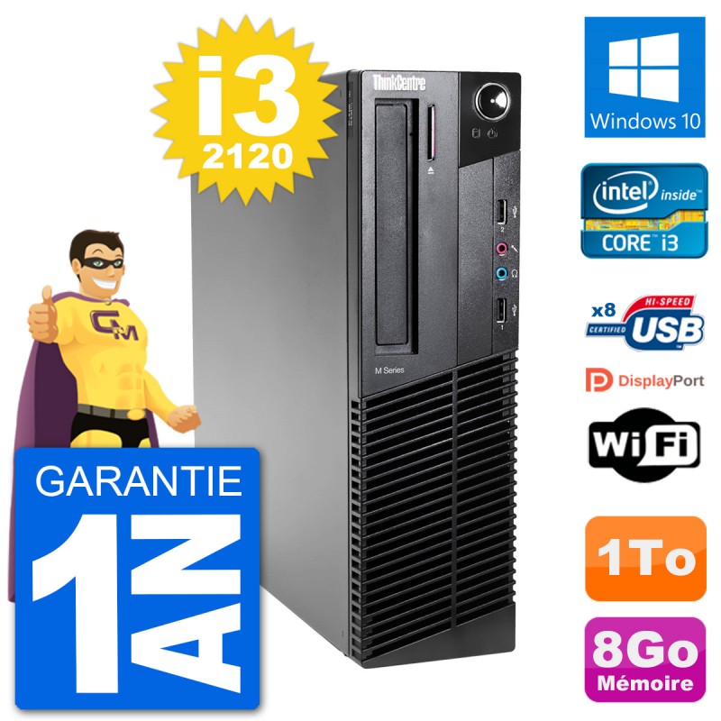 PC Lenovo ThinkCentre M92p SFF - Intel Core i3-2120 3.3 Ghz (3 Mo) - 8 Go DDR3 - Disque Dur 3,5" 1 To - Graveur DVD - Clef Wifi USB - Windows 10 - Garantie 1 an.