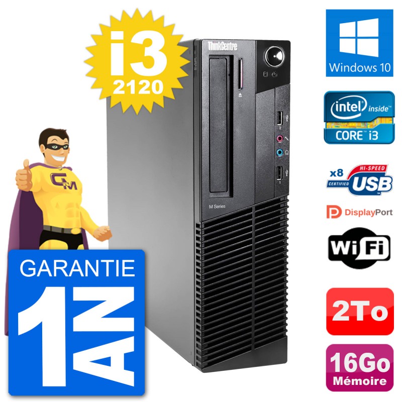 PC Lenovo ThinkCentre M92p SFF - Intel Core i3-2120 3.3 Ghz (3 Mo) - 16 Go DDR3 - Disque Dur 3,5" 2 To - Graveur DVD - Clef Wifi USB - Windows 10 - Garantie 1 an.