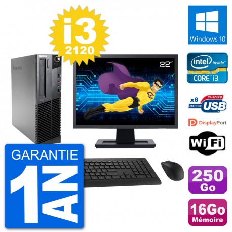 PC Lenovo M92p SFF - Intel Core i3-2120 3.3 Ghz (3 Mo) - 16 Go DDR3 - Disque Dur 3,5" 250 Go - Graveur DVD - Clef Wifi USB - Windows 10 - Livré avec Ecran 22" + clavier + souris (Marques et modèles variables) - Garantie 1 an.