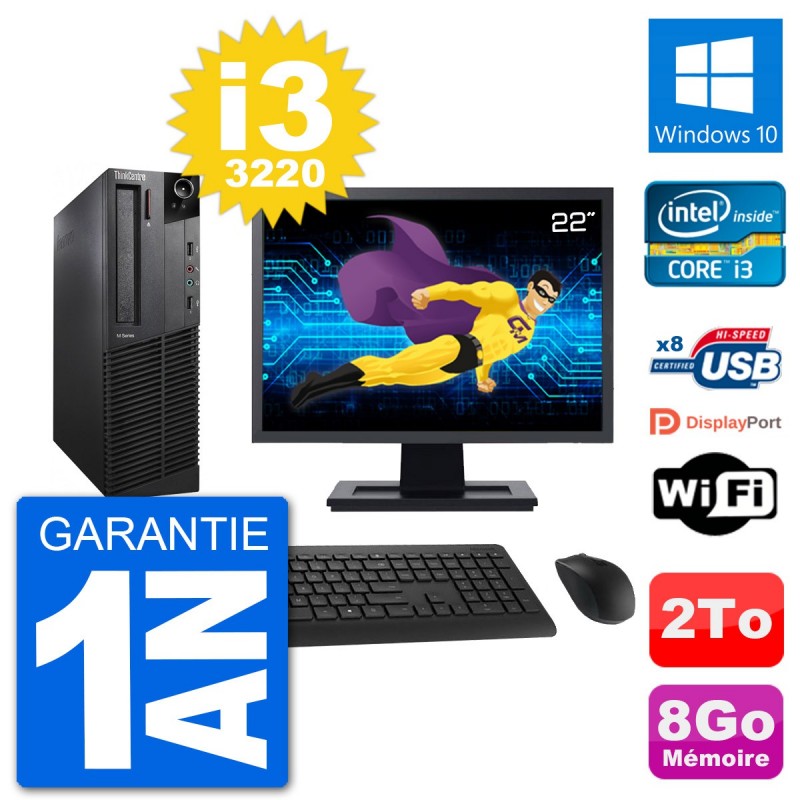PC Lenovo M92p SFF - Intel Core i3-3220 3.3 Ghz (3 Mo) - 8 Go DDR3 - Disque Dur 3,5" 2 To - Graveur DVD - Clef Wifi USB - Windows 10 - Livré avec Ecran 22" + clavier + souris (Marques et modèles variables) - Garantie 1 an.