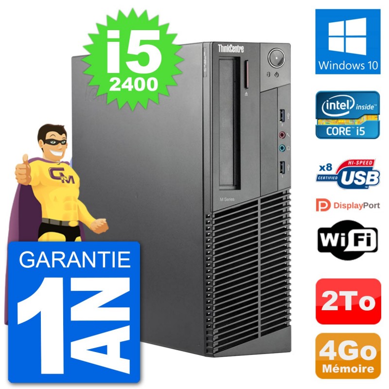 PC Lenovo ThinkCentre M92p SFF - Intel Core i5-2400 3.1 Ghz (6 Mo) - 4 Go DDR3 - Disque Dur 3,5" 2 To - Graveur DVD - Clef Wifi USB - Windows 10 - Garantie 1 an.