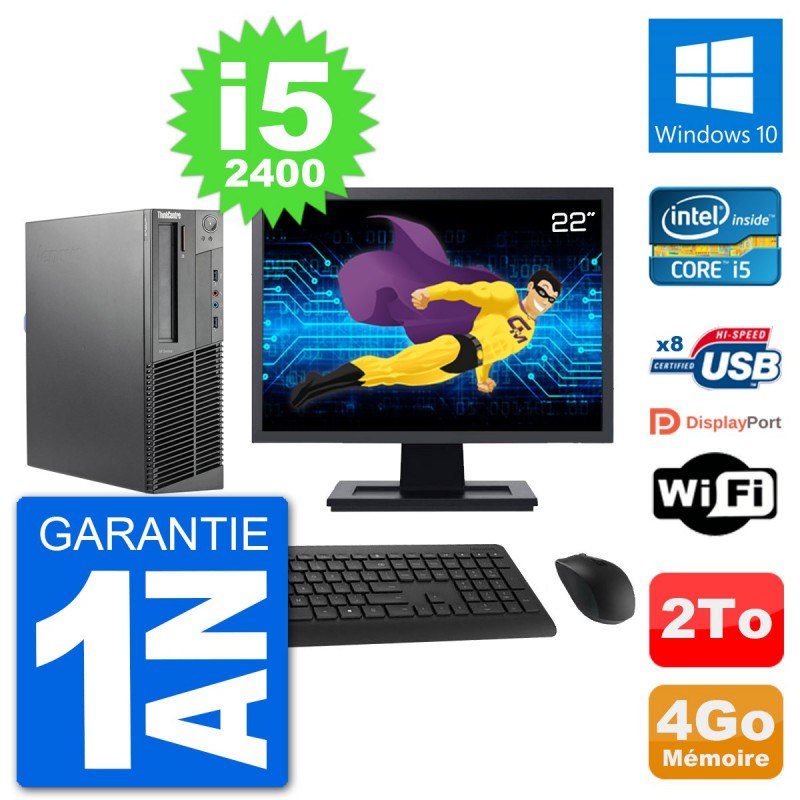 PC Lenovo M92p SFF - Intel Core i5-2400 3.1 Ghz (6 Mo) - 4 Go DDR3 - Disque Dur 3,5" 2 To - Graveur DVD - Clef Wifi USB - Windows 10 - Livré avec Ecran 22" + clavier + souris (Marques et modèles variables) - Garantie 1 an.