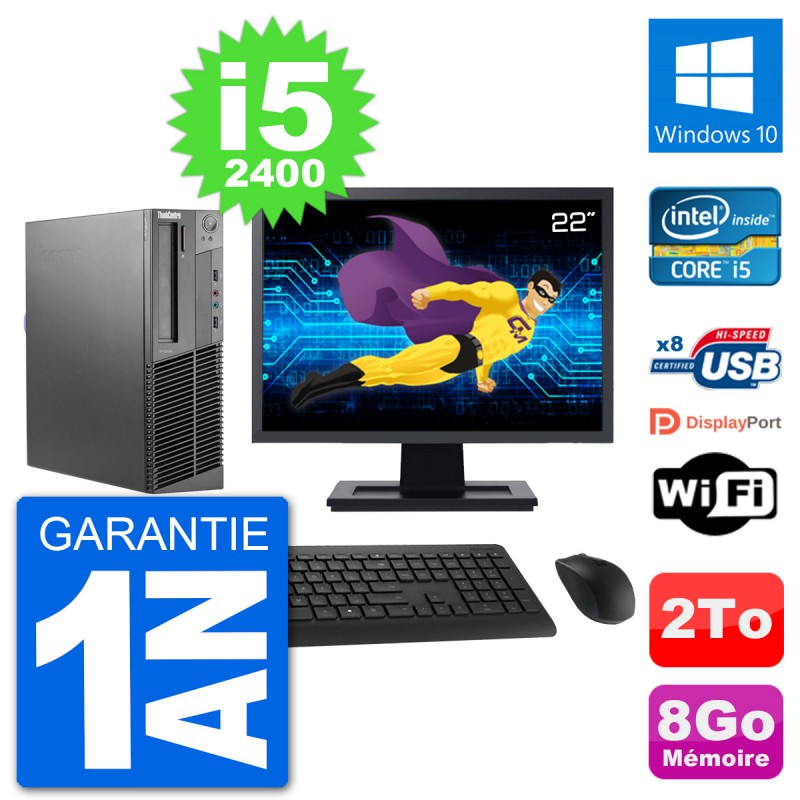 PC Lenovo M92p SFF - Intel Core i5-2400 3.1 Ghz (6 Mo) - 8 Go DDR3 - Disque Dur 3,5" 2 To - Graveur DVD - Clef Wifi USB - Windows 10 - Livré avec Ecran 22" + clavier + souris (Marques et modèles variables) - Garantie 1 an.