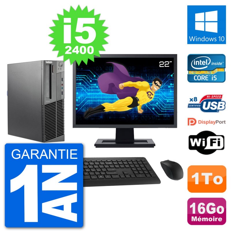 PC Lenovo M92p SFF Ecran 22" Intel i5-2400 RAM 16Go Disque 1To Windows 10 Wifi