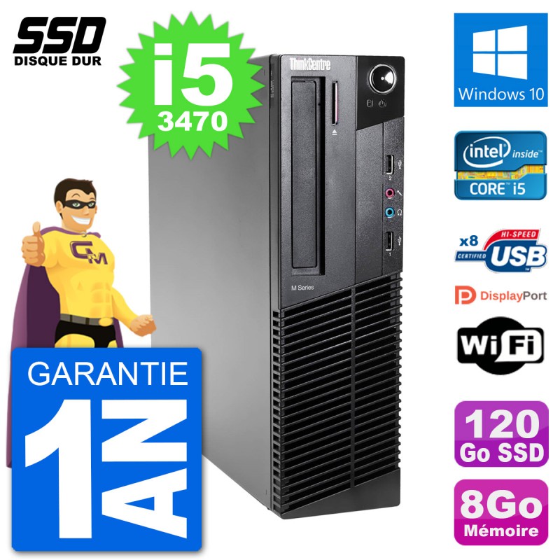 PC Lenovo ThinkCentre M92p SFF - Intel Core i5-3470 3.2 Ghz (6 Mo) - 8 Go DDR3 - Disque Dur SSD 120 Go - Graveur DVD - Clef Wifi USB - Windows 10 - Garantie 1 an.