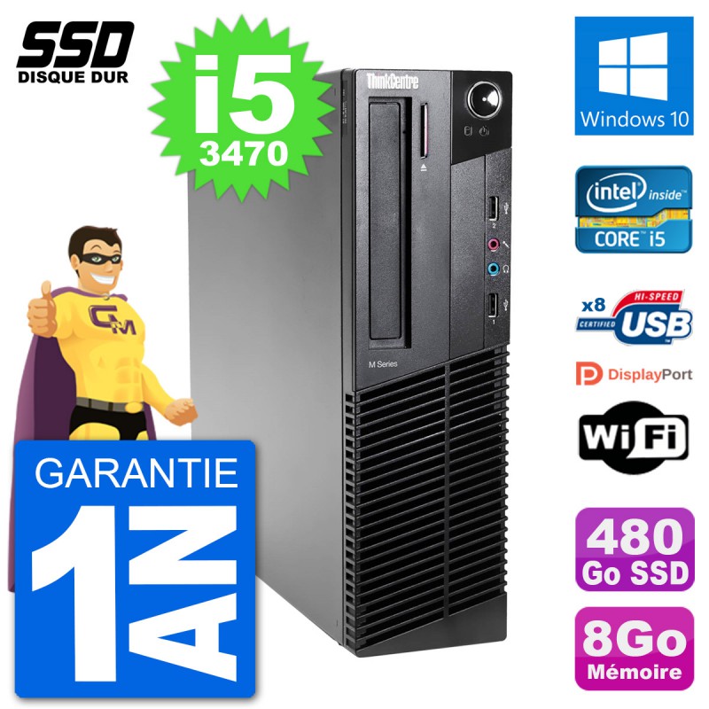PC Lenovo ThinkCentre M92p SFF - Intel Core i5-3470 3.2 Ghz (6 Mo) - 8 Go DDR3 - Disque Dur SSD 480 Go - Graveur DVD - Clef Wifi USB - Windows 10 - Garantie 1 an.