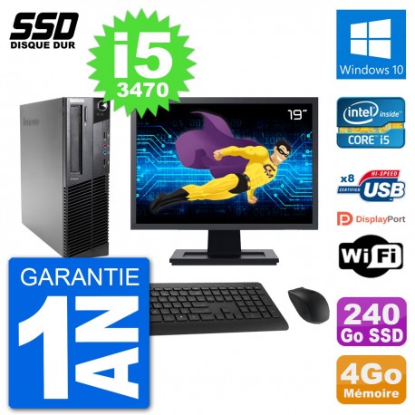 PC Lenovo M92p SFF - Intel Core i5-3470 3.2 Ghz (6 Mo) - 4 Go DDR3 - Disque Dur SSD 240 Go - Graveur DVD - Clef Wifi USB - Windows 10 - Livré avec Ecran 19" + clavier + souris (Marques et modèles variables) - Garantie 1 an.