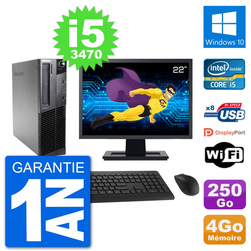 PC Lenovo M92p SFF - Intel Core i5-3470 3.2 Ghz (6 Mo) - 4 Go DDR3 - Disque Dur 3,5" 250 Go - Graveur DVD - Clef Wifi USB - Windows 10 - Livré avec Ecran 22" + clavier + souris (Marques et modèles variables) - Garantie 1 an.