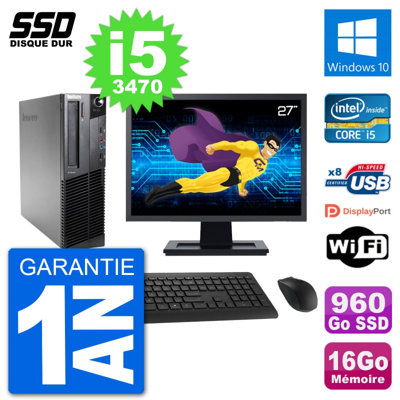 PC Lenovo M92p SFF - Intel Core i5-3470 3.2 Ghz (6 Mo) - 16 Go DDR3 - Disque Dur SSD 960 Go - Graveur DVD - Clef Wifi USB - Windows 10 - Livré avec Ecran 27" + clavier + souris (Marques et modèles variables) - Garantie 1 an.
