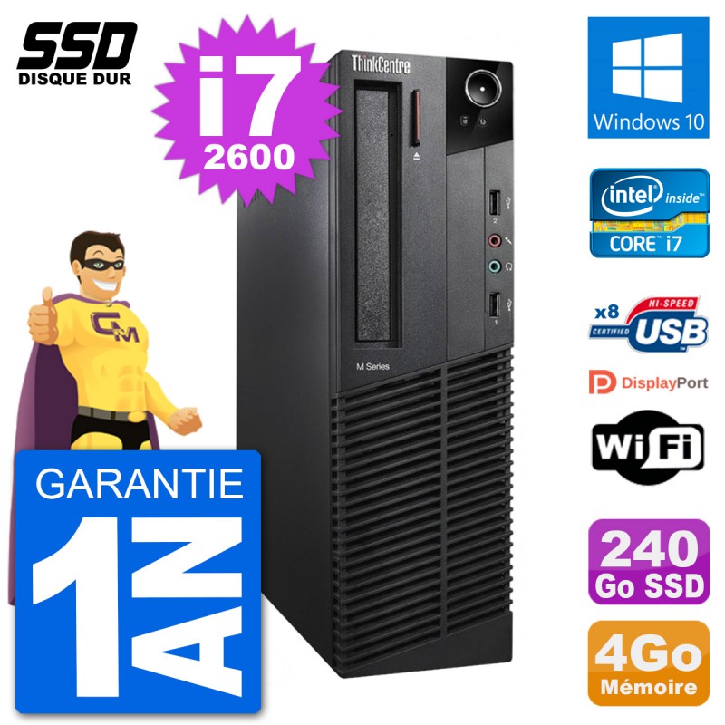 PC Lenovo ThinkCentre M92p SFF - Intel Core i7-2600 3.4 Ghz (8 Mo) - 4 Go DDR3 - Disque Dur SSD 240 Go - Graveur DVD - Clef Wifi USB - Windows 10 - Garantie 1 an.