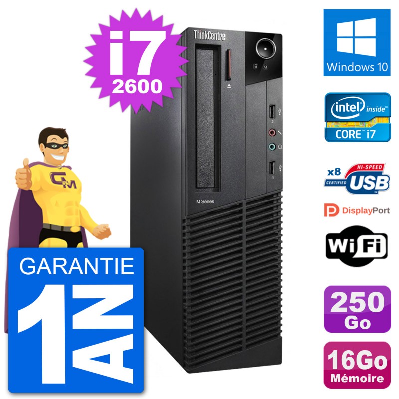 PC Lenovo ThinkCentre M92p SFF - Intel Core i7-2600 3.4 Ghz (8 Mo) - 16 Go DDR3 - Disque Dur 3,5" 250 Go - Graveur DVD - Clef Wifi USB - Windows 10 - Garantie 1 an.
