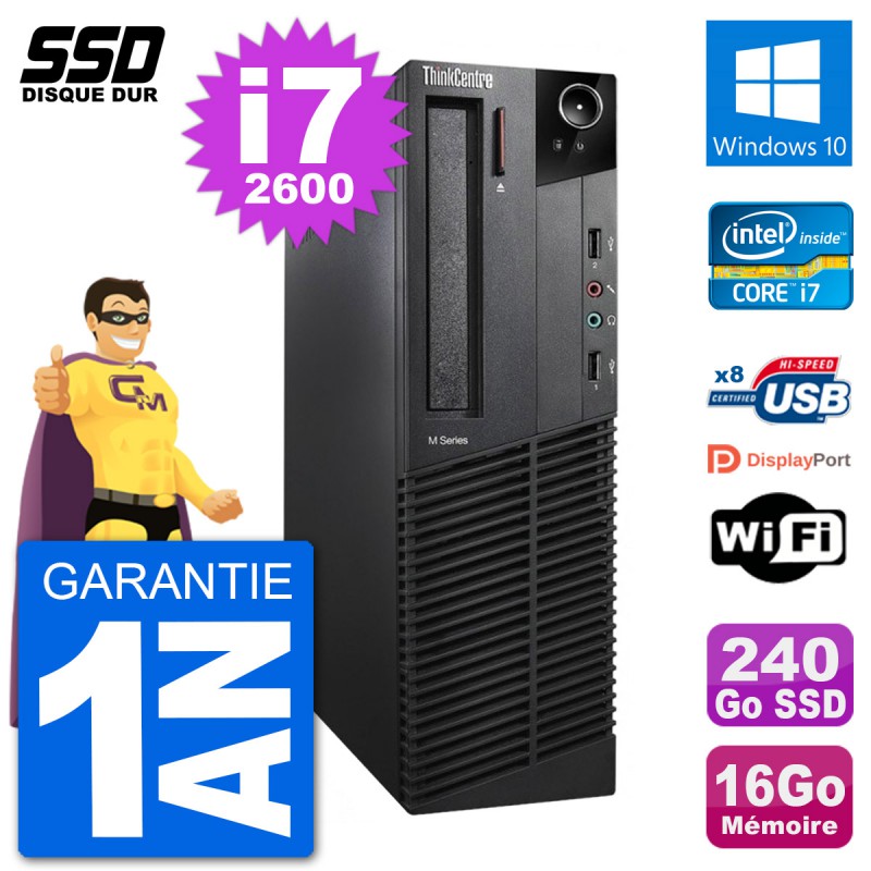 PC Lenovo ThinkCentre M92p SFF - Intel Core i7-2600 3.4 Ghz (8 Mo) - 16 Go DDR3 - Disque Dur SSD 240 Go - Graveur DVD - Clef Wifi USB - Windows 10 - Garantie 1 an.