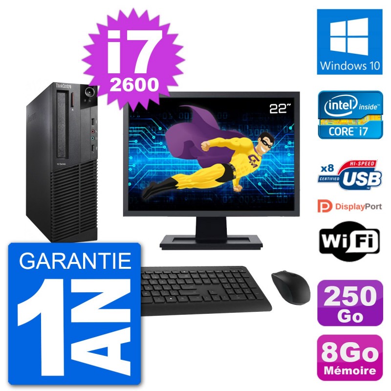 PC Lenovo M92p SFF - Intel Core i7-2600 3.4 Ghz (8 Mo) - 8 Go DDR3 - Disque Dur 3,5" 250 Go - Graveur DVD - Clef Wifi USB - Windows 10 - Livré avec Ecran 22" + clavier + souris (Marques et modèles variables) - Garantie 1 an.