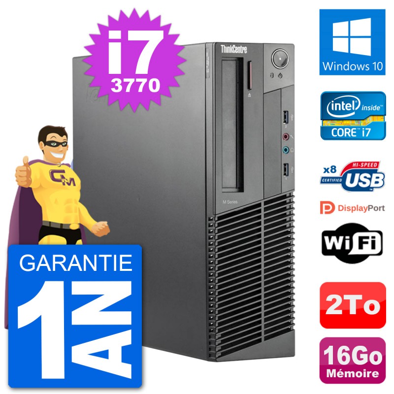 PC Lenovo ThinkCentre M92p SFF - Intel Core i7-3770 3.4 Ghz (8 Mo) - 16 Go DDR3 - Disque Dur 3,5" 2 To - Graveur DVD - Clef Wifi USB - Windows 10 - Garantie 1 an.
