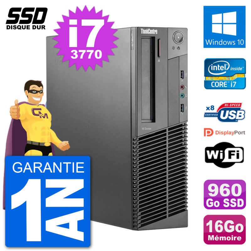 PC Lenovo ThinkCentre M92p SFF - Intel Core i7-3770 3.4 Ghz (8 Mo) - 16 Go DDR3 - Disque Dur SSD 960 Go - Graveur DVD - Clef Wifi USB - Windows 10 - Garantie 1 an.