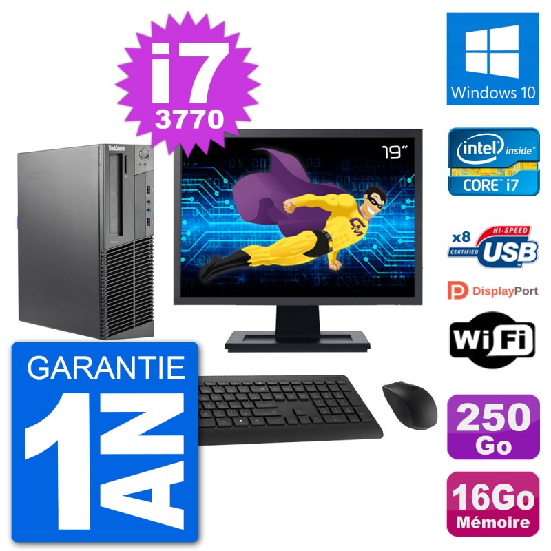 PC Lenovo M92p SFF - Intel Core i7-3770 3.4 Ghz (8 Mo) - 16 Go DDR3 - Disque Dur 3,5" 250 Go - Graveur DVD - Clef Wifi USB - Windows 10 - Livré avec Ecran 19" + clavier + souris (Marques et modèles variables) - Garantie 1 an.