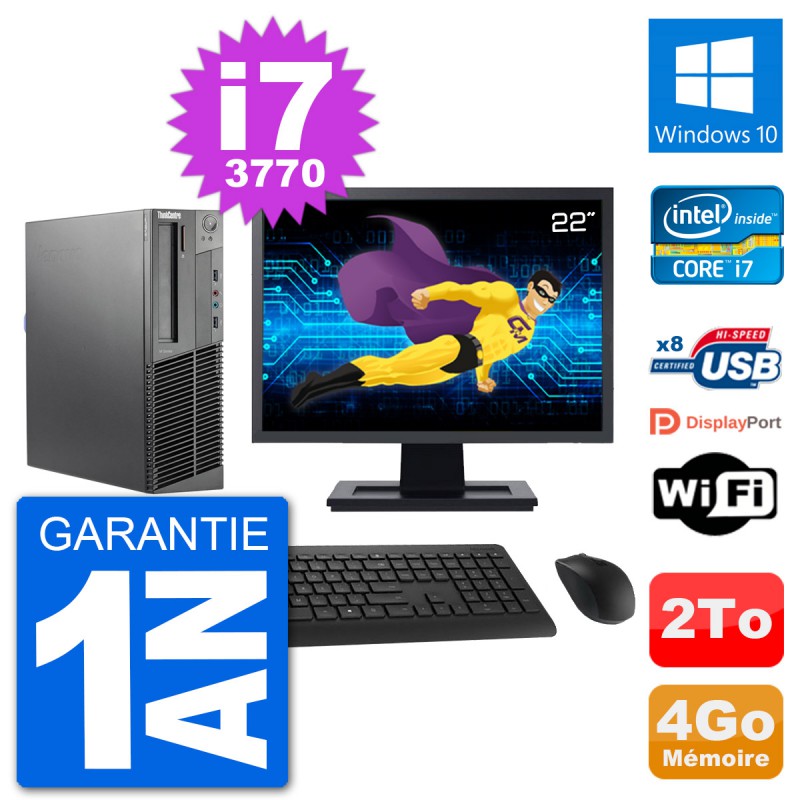 PC Lenovo M92p SFF - Intel Core i7-3770 3.4 Ghz (8 Mo) - 4 Go DDR3 - Disque Dur 3,5" 2 To - Graveur DVD - Clef Wifi USB - Windows 10 - Livré avec Ecran 22" + clavier + souris (Marques et modèles variables) - Garantie 1 an.