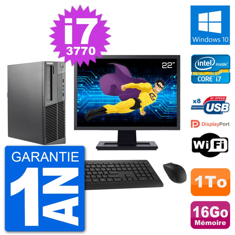 PC Lenovo M92p SFF Ecran 22" Intel i7-3770 RAM 16Go Disque 1To Windows 10 Wifi