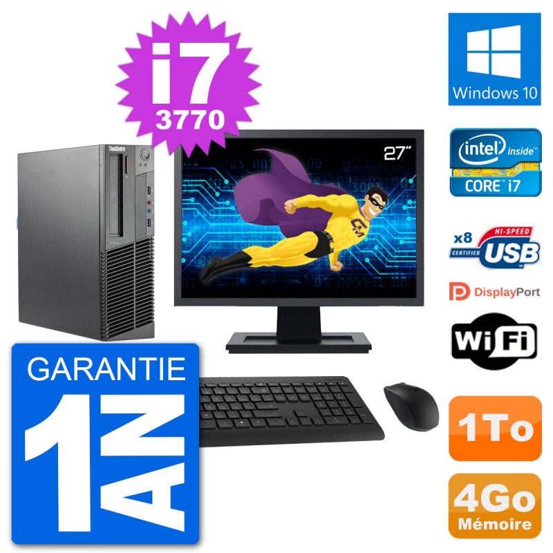 PC Lenovo M92p SFF - Intel Core i7-3770 3.4 Ghz (8 Mo) - 4 Go DDR3 - Disque Dur 3,5" 1 To - Graveur DVD - Clef Wifi USB - Windows 10 - Livré avec Ecran 27" + clavier + souris (Marques et modèles variables) - Garantie 1 an.