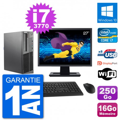 PC Lenovo M92p SFF - Intel Core i7-3770 3.4 Ghz (8 Mo) - 16 Go DDR3 - Disque Dur 3,5" 250 Go - Graveur DVD - Clef Wifi USB - Windows 10 - Livré avec Ecran 27" + clavier + souris (Marques et modèles variables) - Garantie 1 an.