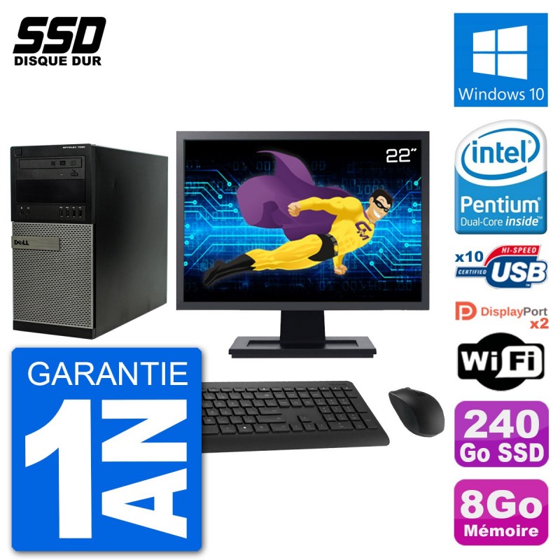PC Dell 7020 MT - Intel Dual-Core G3220 3.0 Ghz (3 Mo) - 8 Go DDR3 - Disque Dur SSD 240 Go - Graveur DVD - Clef Wifi USB - Windows 10 - Livré avec Ecran 22" + clavier + souris (Marques et modèles variables) - Garantie 1 an.