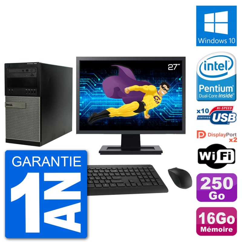 PC Dell 7020 MT - Intel Dual-Core G3220 3.0 Ghz (3 Mo) - 16 Go DDR3 - Disque Dur 3,5" 250 Go - Graveur DVD - Clef Wifi USB - Windows 10 - Livré avec Ecran 27" + clavier + souris (Marques et modèles variables) - Garantie 1 an.