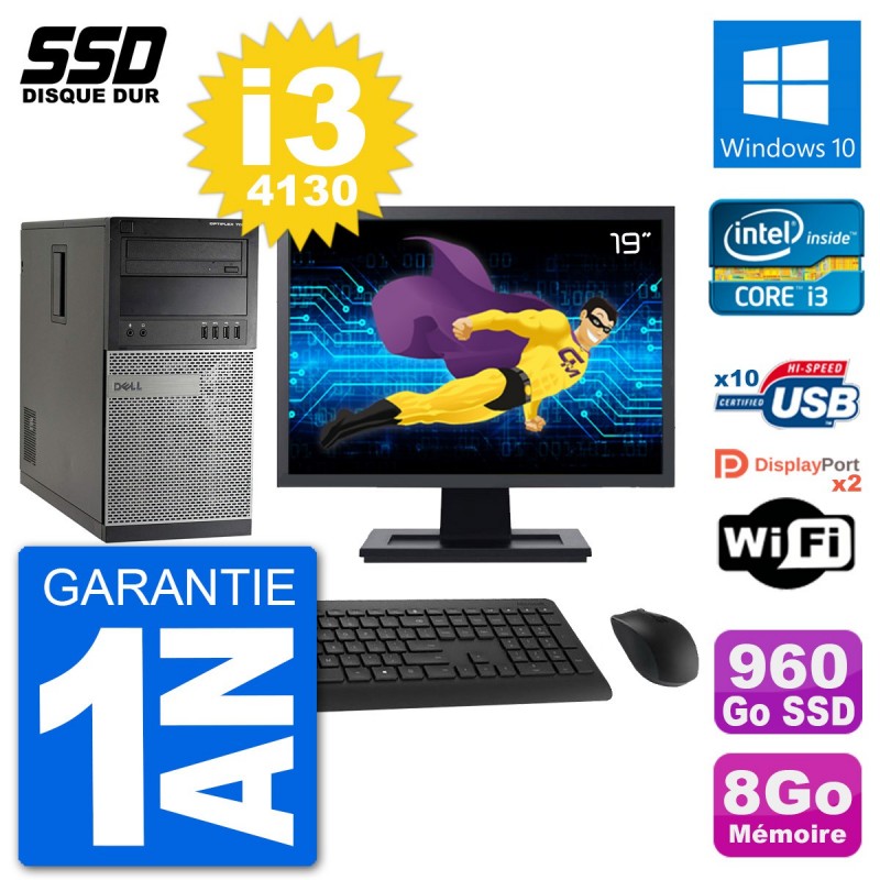 PC Dell 7020 MT - Intel Core i3-4130 3.4 Ghz (3 Mo) - 8 Go DDR3 - Disque Dur SSD 960 Go - Graveur DVD - Clef Wifi USB - Windows 10 - Livré avec Ecran 19" + clavier + souris (Marques et modèles variables) - Garantie 1 an.