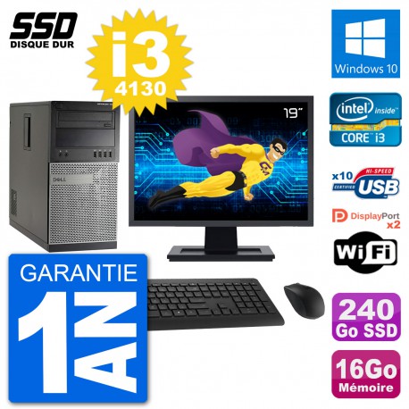 PC Dell 7020 MT - Intel Core i3-4130 3.4 Ghz (3 Mo) - 16 Go DDR3 - Disque Dur SSD 240 Go - Graveur DVD - Clef Wifi USB - Windows 10 - Livré avec Ecran 19" + clavier + souris (Marques et modèles variables) - Garantie 1 an.