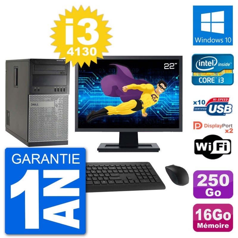 PC Dell 7020 MT - Intel Core i3-4130 3.4 Ghz (3 Mo) - 16 Go DDR3 - Disque Dur 3,5" 250 Go - Graveur DVD - Clef Wifi USB - Windows 10 - Livré avec Ecran 22" + clavier + souris (Marques et modèles variables) - Garantie 1 an.