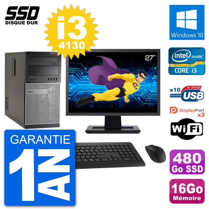 PC Dell 7020 MT - Intel Core i3-4130 3.4 Ghz (3 Mo) - 16 Go DDR3 - Disque Dur SSD 480 Go - Graveur DVD - Clef Wifi USB - Windows 10 - Livré avec Ecran 27" + clavier + souris (Marques et modèles variables) - Garantie 1 an.