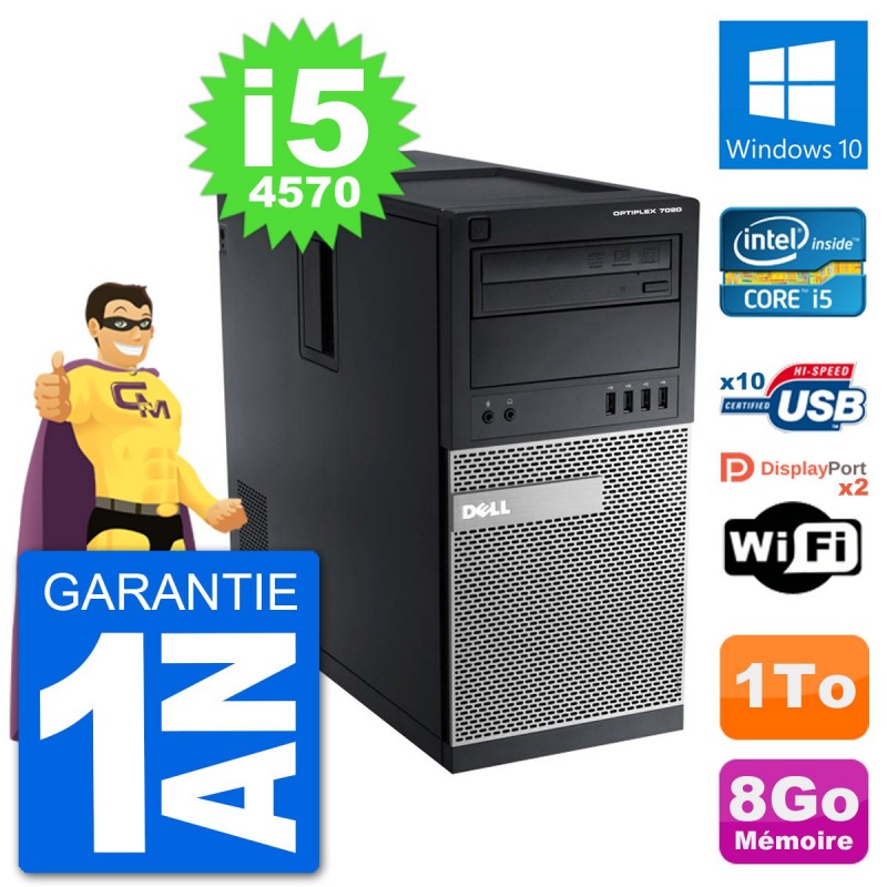 PC Dell Optiplex 7020 MT (Moyenne Tour) - Intel Core i5-4570 3.2 Ghz (6 Mo) - 8 Go DDR3 - Disque Dur 3,5" 1 To - Graveur DVD - Clef Wifi USB - Windows 10 - Garantie 1 an.