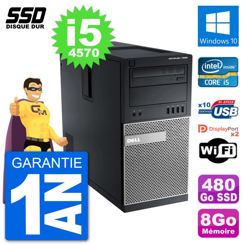 PC Dell Optiplex 7020 MT (Moyenne Tour) - Intel Core i5-4570 3.2 Ghz (6 Mo) - 8 Go DDR3 - Disque Dur SSD 480 Go - Graveur DVD - Clef Wifi USB - Windows 10 - Garantie 1 an.