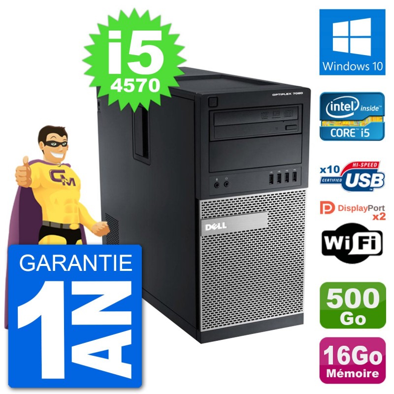 PC Dell Optiplex 7020 MT (Moyenne Tour) - Intel Core i5-4570 3.2 Ghz (6 Mo) - 16 Go DDR3 - Disque Dur 3,5" 500 Go - Graveur DVD - Clef Wifi USB - Windows 10 - Garantie 1 an.
