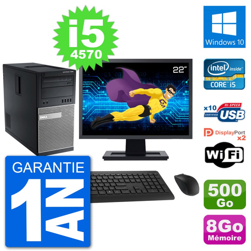 PC Dell 7020 MT - Intel Core i5-4570 3.2 Ghz (6 Mo) - 8 Go DDR3 - Disque Dur 3,5" 500 Go - Graveur DVD - Clef Wifi USB - Windows 10 - Livré avec Ecran 22" + clavier + souris (Marques et modèles variables) - Garantie 1 an.