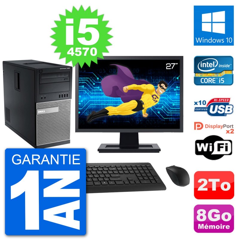 PC Dell 7020 MT - Intel Core i5-4570 3.2 Ghz (6 Mo) - 8 Go DDR3 - Disque Dur 3,5" 2 To - Graveur DVD - Clef Wifi USB - Windows 10 - Livré avec Ecran 27" + clavier + souris (Marques et modèles variables) - Garantie 1 an.