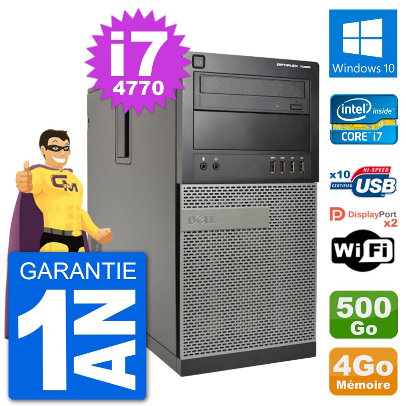 PC Dell Optiplex 7020 MT (Moyenne Tour) - Intel Core i7-4770 3.4 Ghz (8 Mo) - 4 Go DDR3 - Disque Dur 3,5" 500 Go - Graveur DVD - Clef Wifi USB - Windows 10 - Garantie 1 an.