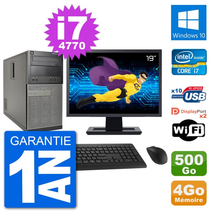 PC Dell 7020 MT - Intel Core i7-4770 3.4 Ghz (8 Mo) - 4 Go DDR3 - Disque Dur 3,5" 500 Go - Graveur DVD - Clef Wifi USB - Windows 10 - Livré avec Ecran 19" + clavier + souris (Marques et modèles variables) - Garantie 1 an.