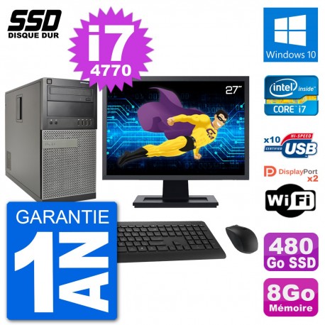 PC Dell 7020 MT - Intel Core i7-4770 3.4 Ghz (8 Mo) - 8 Go DDR3 - Disque Dur SSD 480 Go - Graveur DVD - Clef Wifi USB - Windows 10 - Livré avec Ecran 27" + clavier + souris (Marques et modèles variables) - Garantie 1 an.