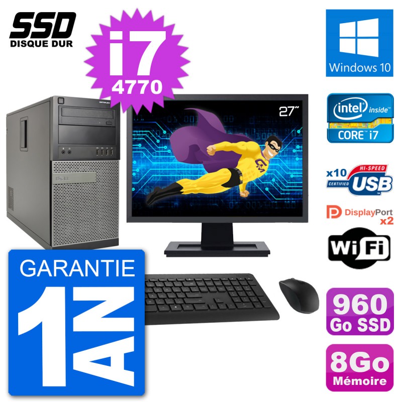 PC Dell 7020 MT - Intel Core i7-4770 3.4 Ghz (8 Mo) - 8 Go DDR3 - Disque Dur SSD 960 Go - Graveur DVD - Clef Wifi USB - Windows 10 - Livré avec Ecran 27" + clavier + souris (Marques et modèles variables) - Garantie 1 an.